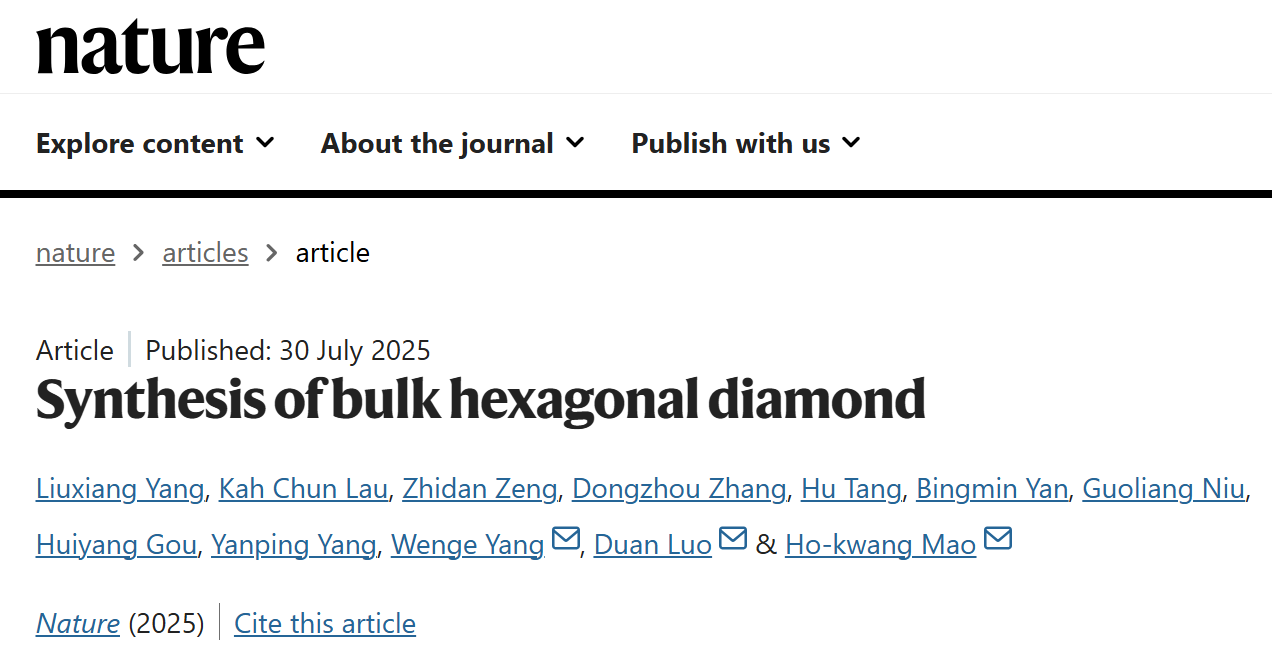 7月30日,《自然》(Nature)(DOI:10.1038/s41586-025-09343-x.)[1]刊發了北京高壓科學研究中心毛河光院士、楊文革團隊與超快光科學與技術全國重點實驗室、條紋相機工程中心羅端團隊的里程碑式成果,聯合研究團隊首次在國際上成功合成出百微米-毫米級、結構有序、高純度的六方金剛石塊體樣品,結合單晶X射線衍射、高分辨電子顯微成像及能譜學等多種表征手段,從不同角度全面證明了六方金剛石純相樣品的成功合成。